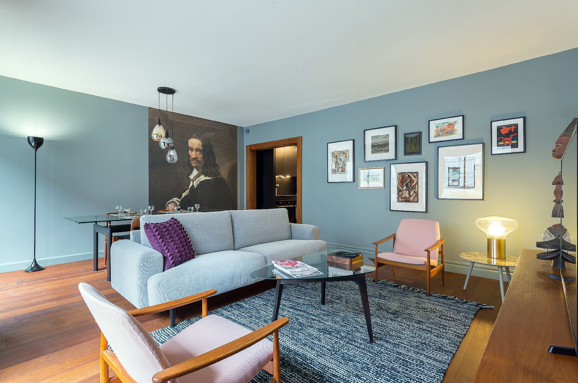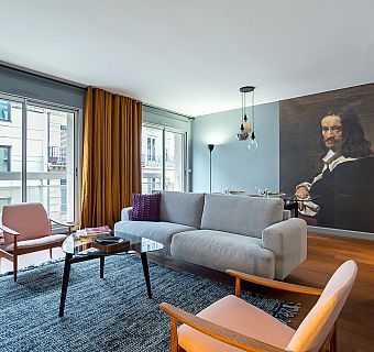 Salon moderne avec un canapé gris, deux fauteuils roses, une table basse en verre, de grandes fenêtres avec des rideaux dorés et une fresque murale représentant un homme en costume historique. | 2BeApart Lyon