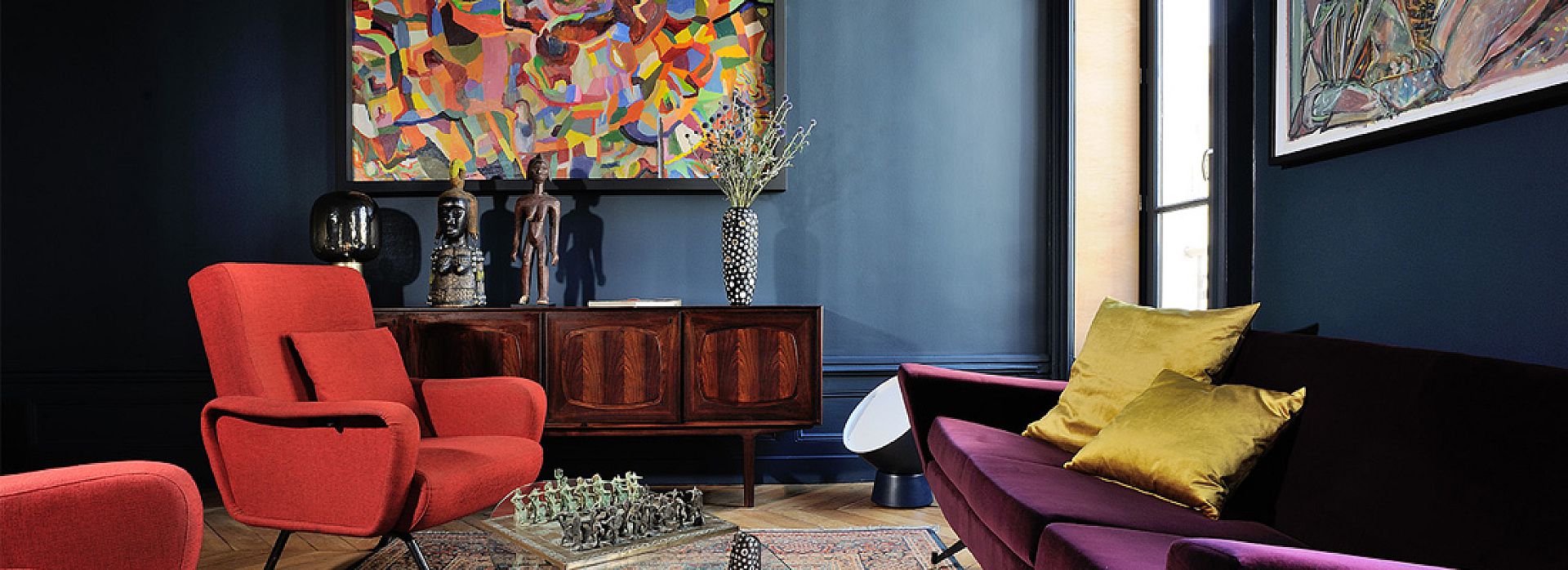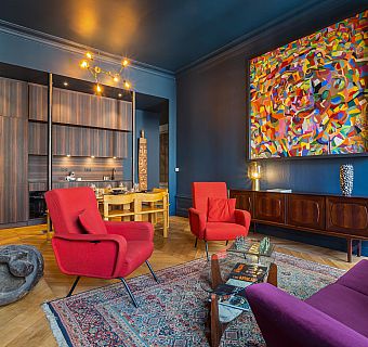 Un salon moderne avec des murs bleu foncé, des fauteuils rouges, une grande peinture abstraite colorée, un buffet en bois, un tapis à motifs et une cuisine ouverte avec des armoires en bois en arrière-plan. | 2BeApart Lyon