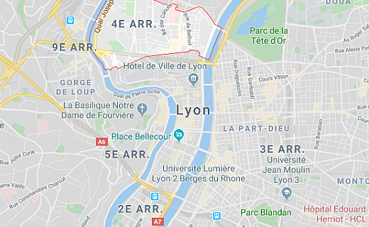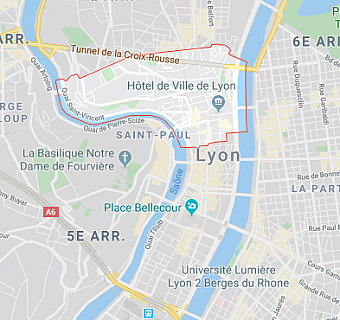 Carte du centre de Lyon, France, mettant en évidence une zone au nord avec des rues, des rivières, des points d'intérêt comme l'Hôtel de Ville de Lyon, la Place Bellecour, et l'Université Lumière Lyon 2, ainsi que le Tunnel de la Croix-Rousse. | 2BeApart Lyon