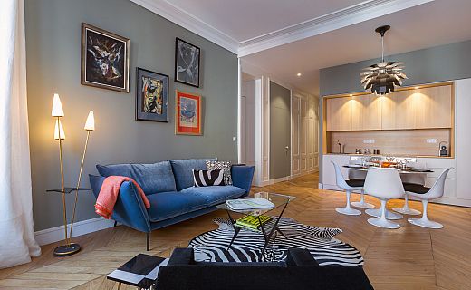 Salon moderne avec un canapé bleu, une table basse en verre, un tapis zébré et des lampes hautes ; la pièce comprend des œuvres d'art murales, un coin repas confortable avec des chaises blanches et un luminaire contemporain au-dessus d'une cuisine en bois. | 2BeApart Lyon