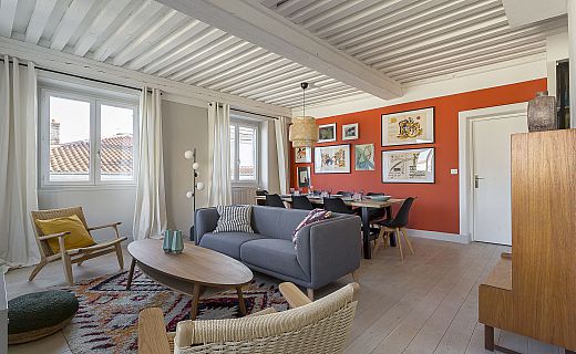Salon et salle à manger lumineux avec un canapé gris, une table basse en bois, une chaise tressée, un tapis coloré, une table de salle à manger avec des chaises noires et un mur d'accent orange décoré d'œuvres d'art encadrées. Les poutres blanches et les grandes fenêtres apportent de la lumière naturelle. | 2BeApart Lyon