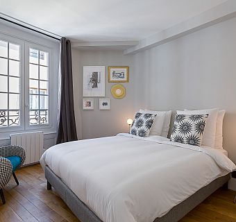 Une chambre confortable avec un grand lit, une literie blanche, des oreillers à motifs, un sol en bois, un fauteuil moderne, des œuvres d'art murales et une grande fenêtre avec des rideaux qui laissent entrer la lumière naturelle. | 2BeApart Lyon