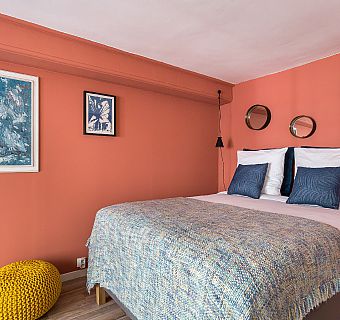 Une chambre confortable avec des murs corail, un lit avec des draps bleus et blancs, des coussins bleus, deux miroirs ronds, des œuvres d'art encadrées et un pouf en tricot jaune sur un sol en bois. | 2BeApart Lyon