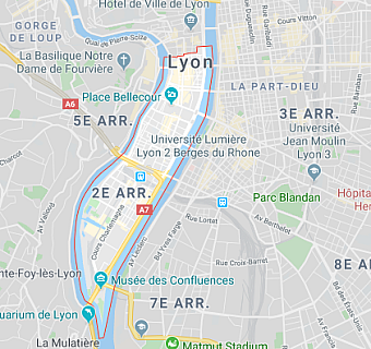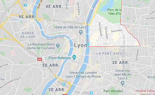 Carte montrant le centre de Lyon, France, avec les principaux quartiers, le Rhône et la Saône, des monuments comme l'Hôtel de Ville, et des parcs comme le Parc de la Tête d'Or et le Parc Blandan. | 2BeApart Lyon