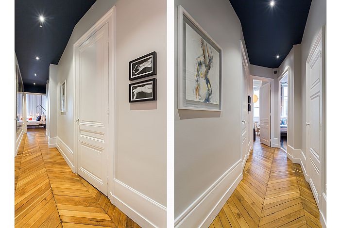Ainsi, disséminées aux quatre coins de l’appartement, on retrouve des œuvres d’art uniques, certaines créées spécialement pour l’appartement, dont le croquis des forgerons de Puvis de Chavannes agrandi et transposé ici au plafond de la chambre principale.