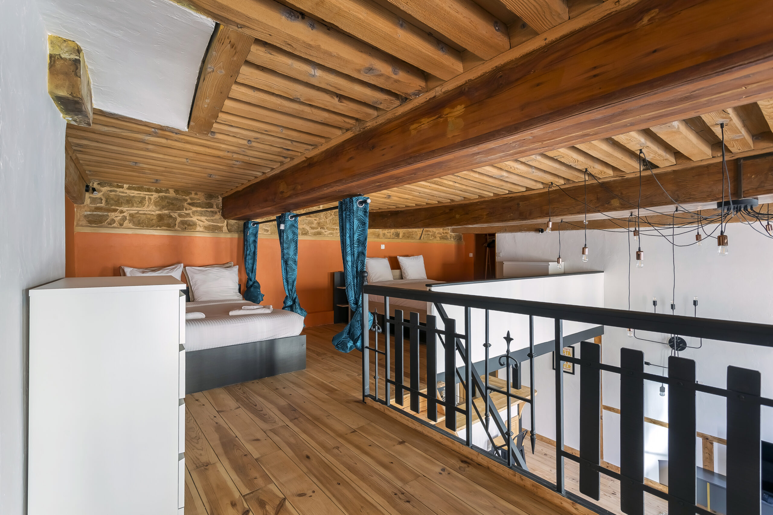 A l’étage, une très grande mezzanine avec 2 lits doubles (140cm and 160cm) et commodes de rangement.
