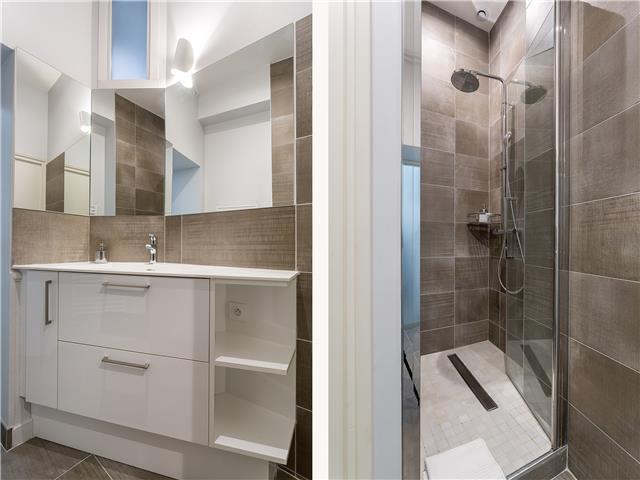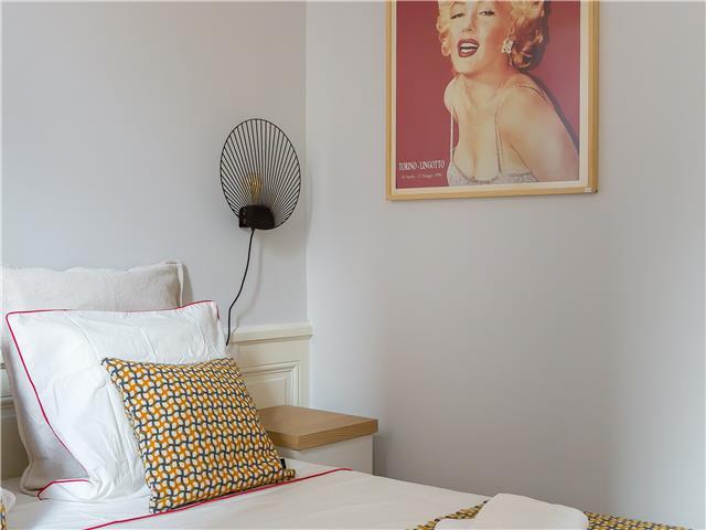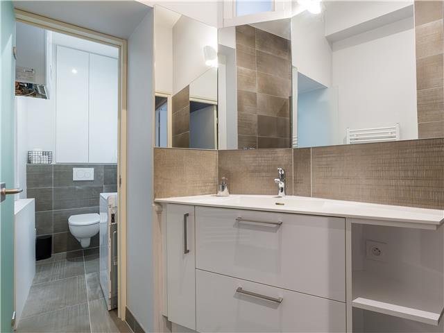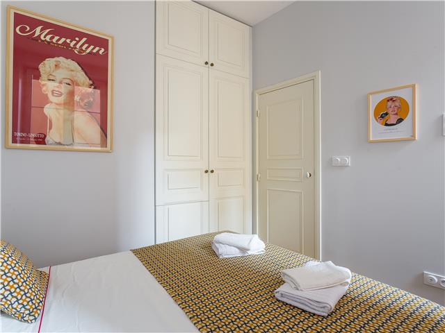 La chambre dispose d’un lit double et d’un grand placard intégré. L’appartement comprend également une salle de bain moderne et deux toilettes, un vrai plus pour un logement de cette taille.