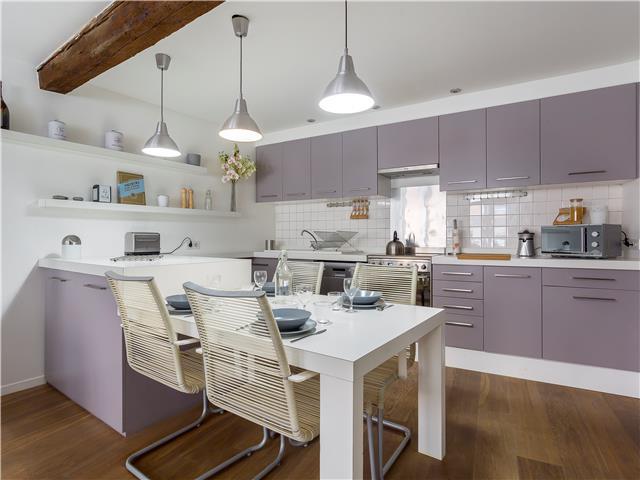 L’appartement se compose d’une grande pièce à vivre chaleureuse avec salon, canapé, table de salle à manger, et une cuisine entièrement équipée (four, réfrigérateur/congélateur, micro-ondes, lave-vaisselle, cave à vin).