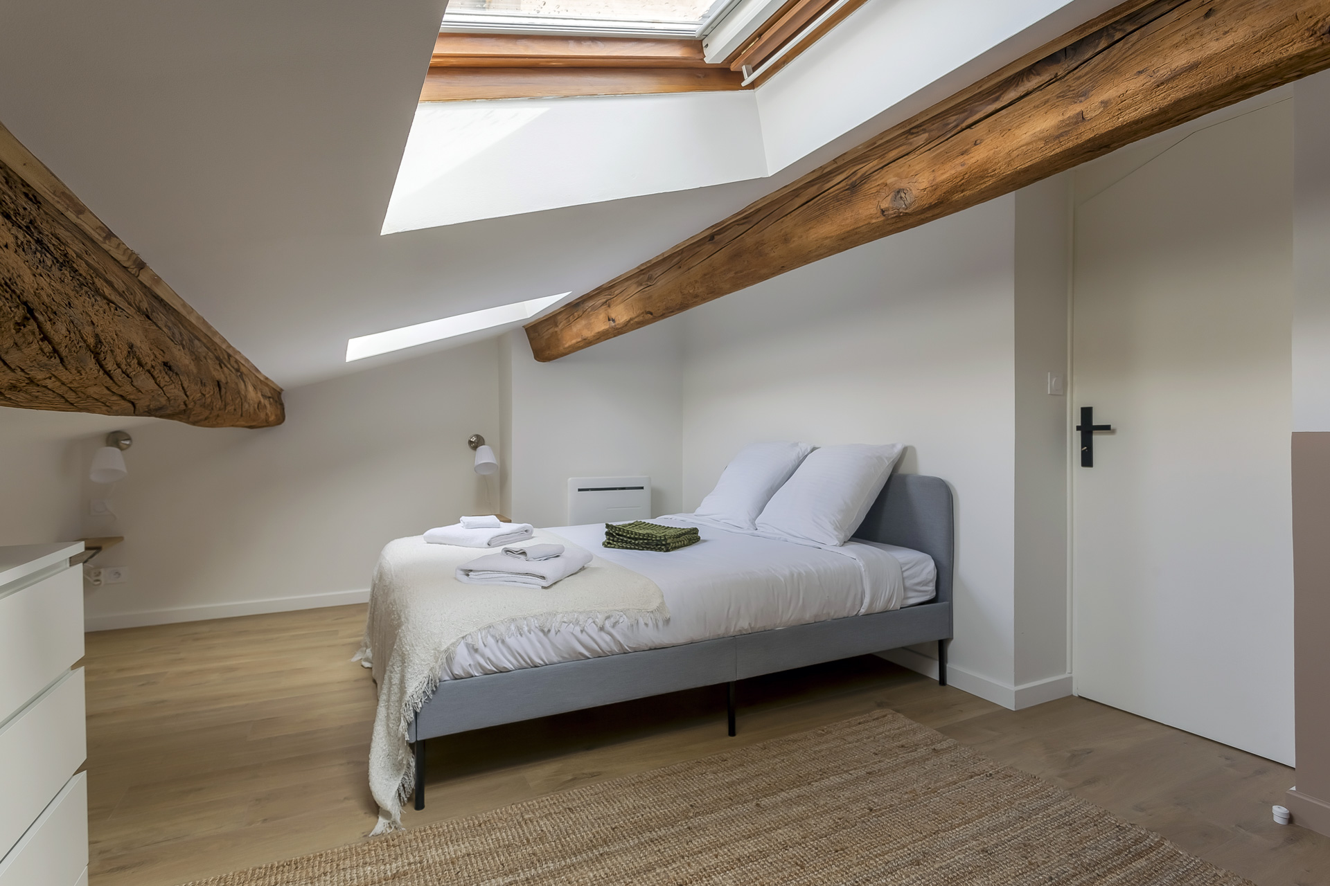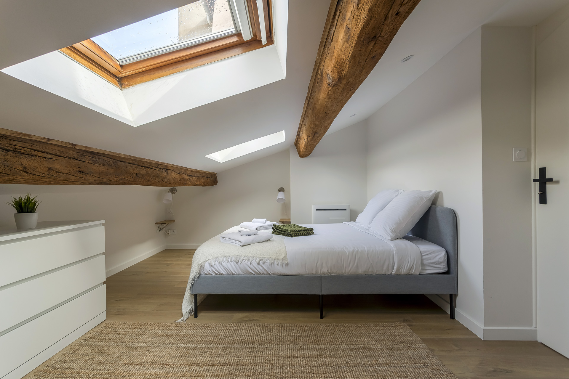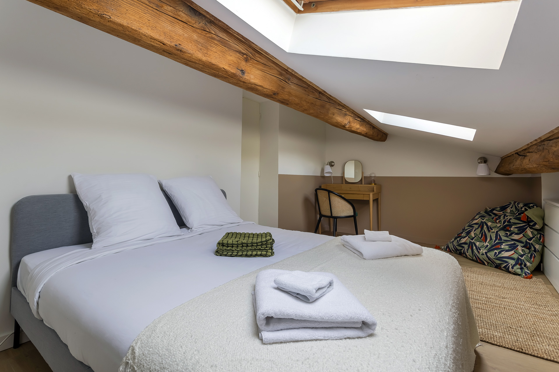 - Chambre : Une chambre calme avec un lit double (160 cm) et un placard intégré pour un rangement optimal.