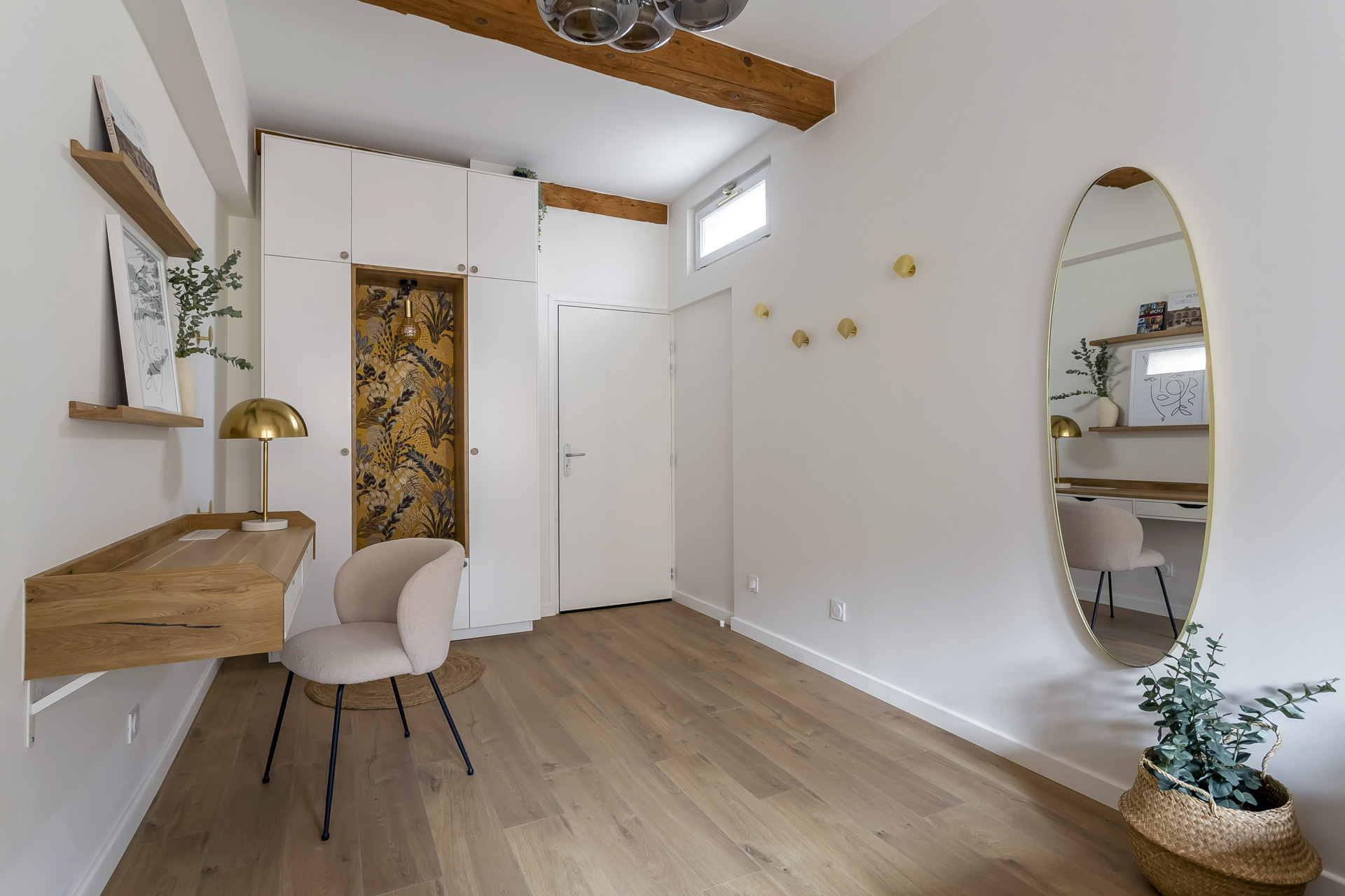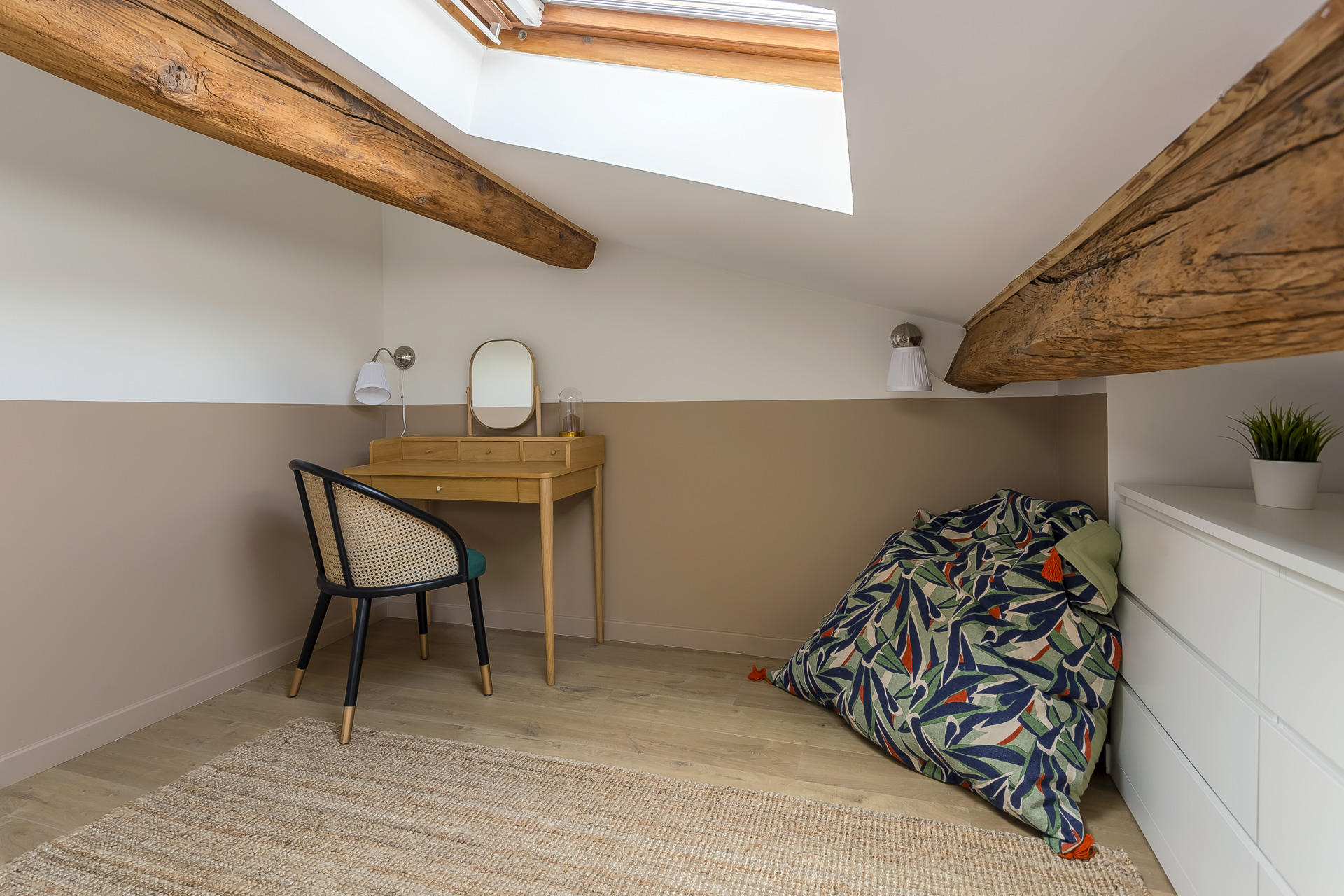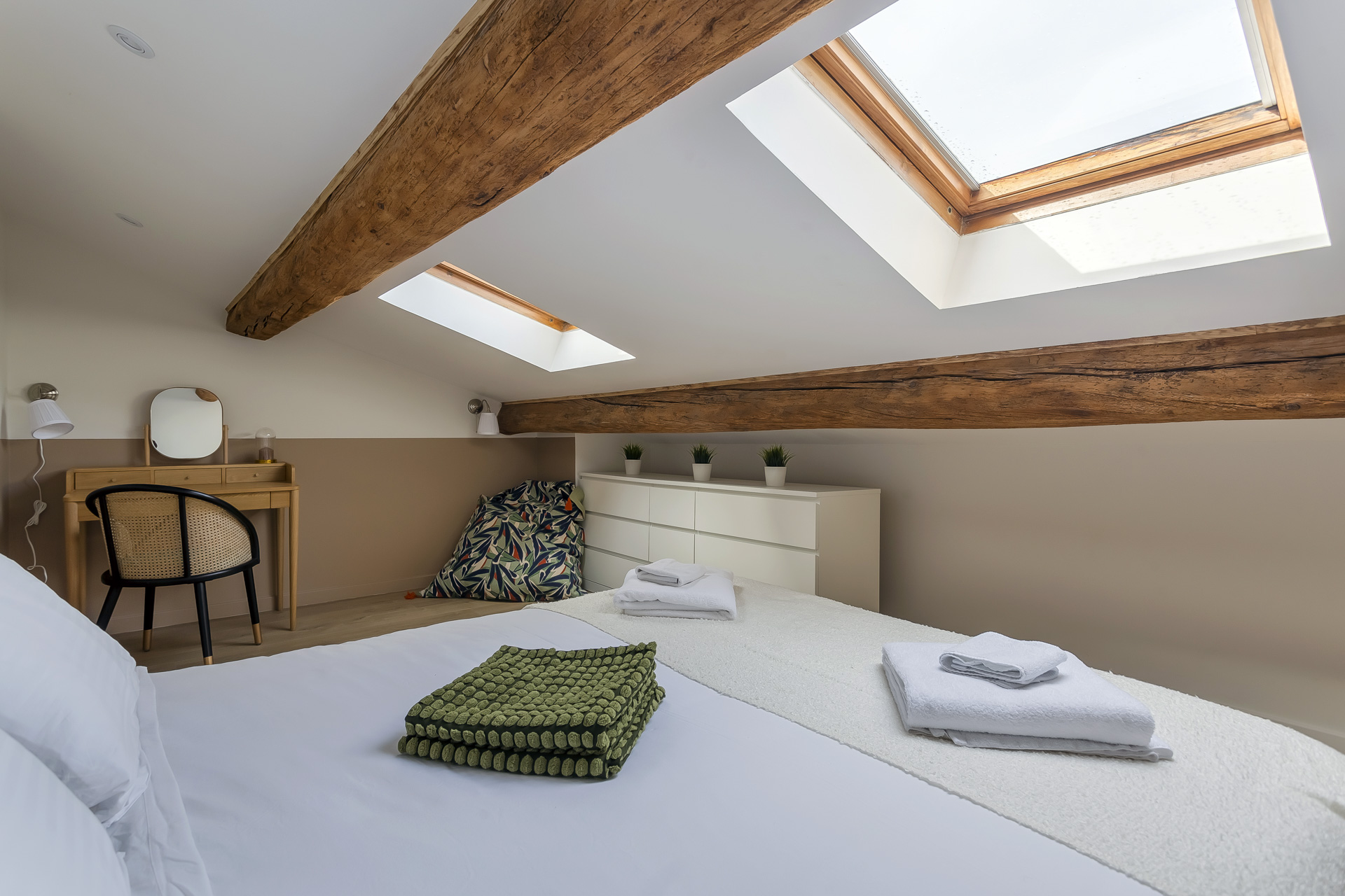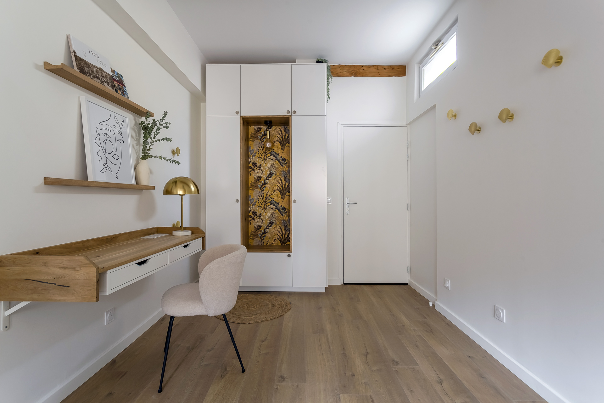 - Chambre : Une chambre calme avec un lit double (160 cm) et un placard intégré pour un rangement optimal.