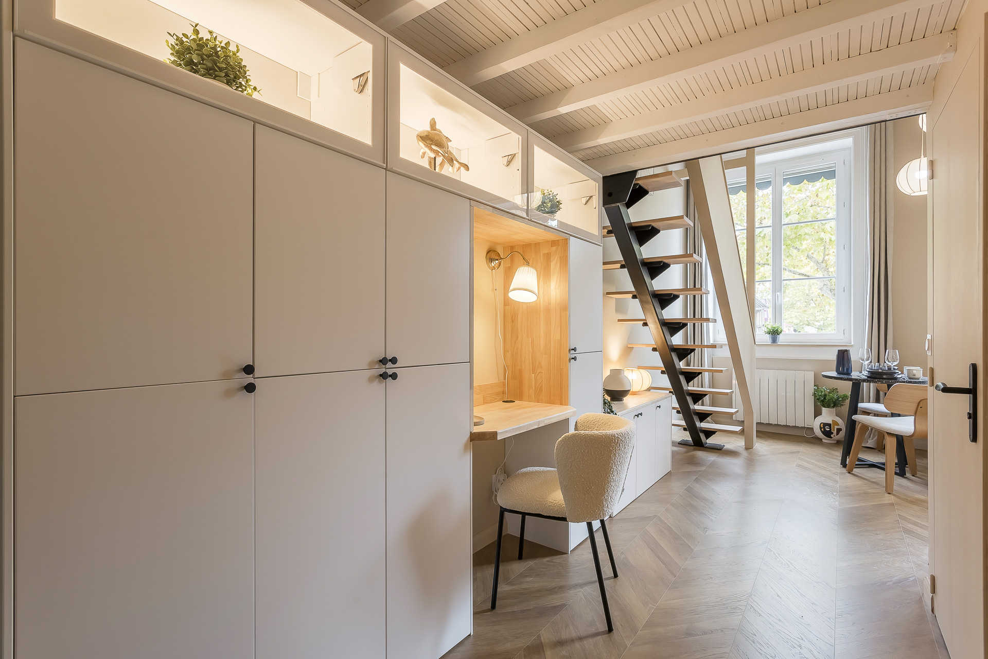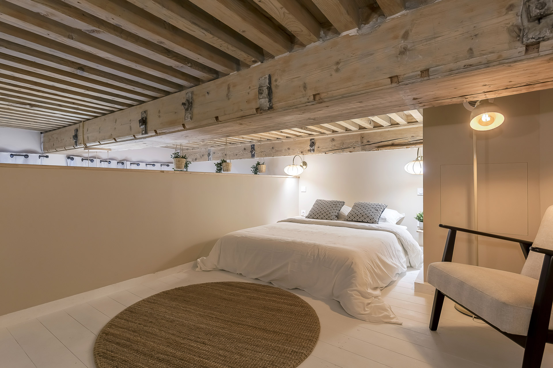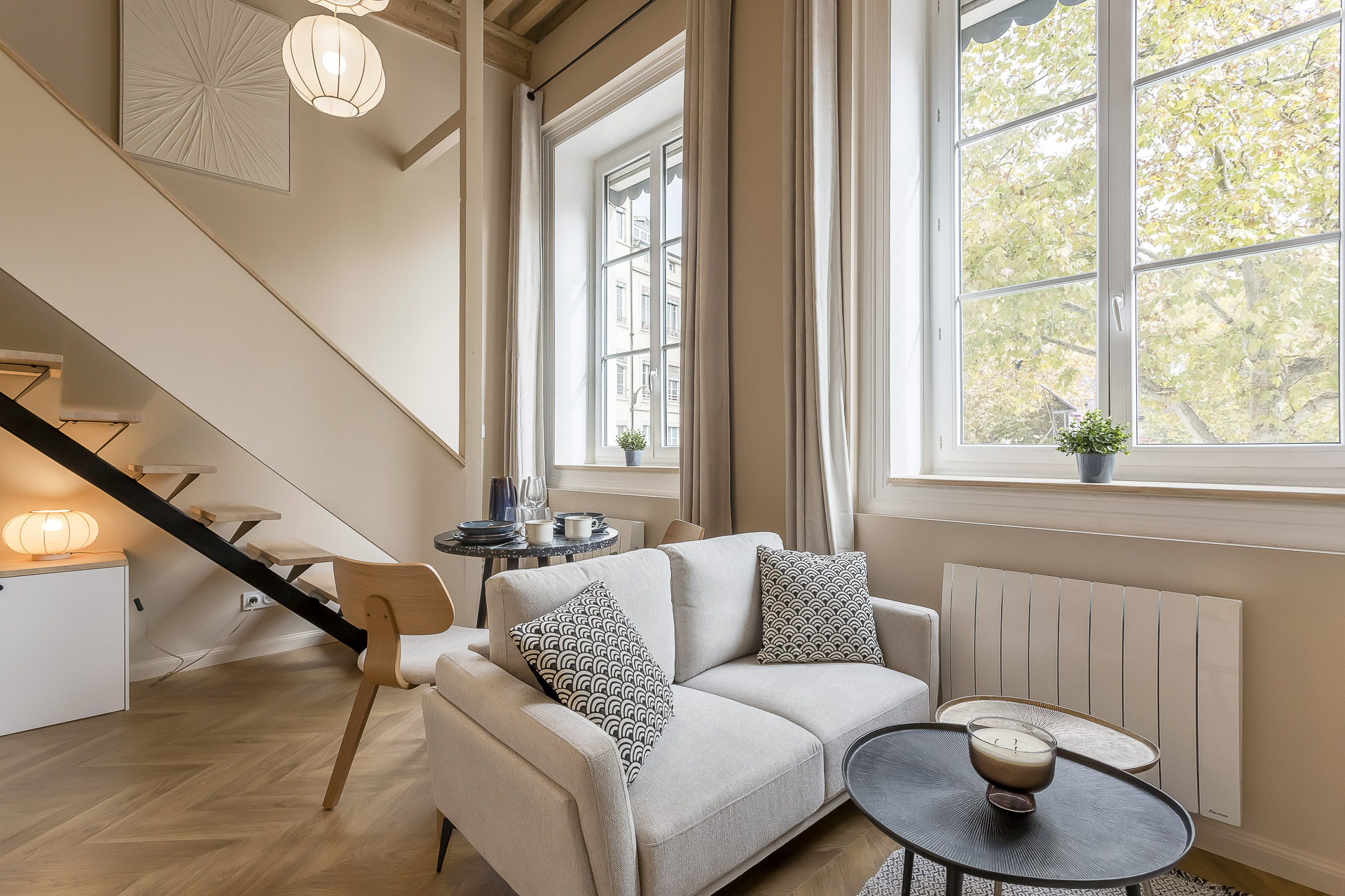 Fully renovated and situated on the 1st floor (no elevator), it combines a contemporary style with a cozy mezzanine and a central location just a few minutes’ walk from the Presqu’île.