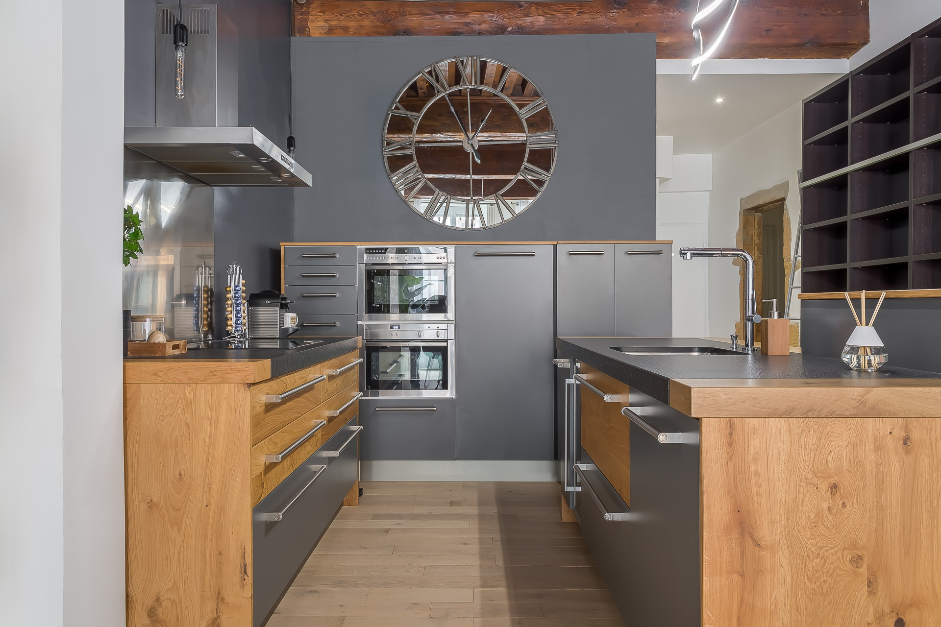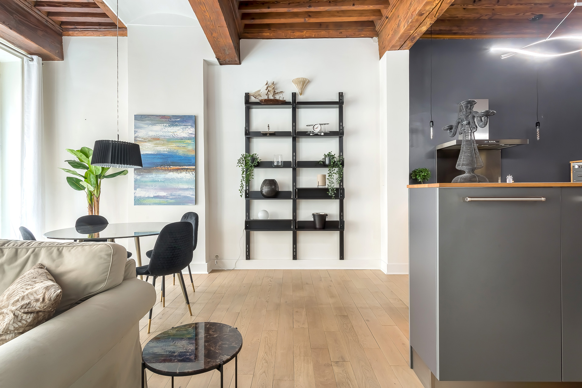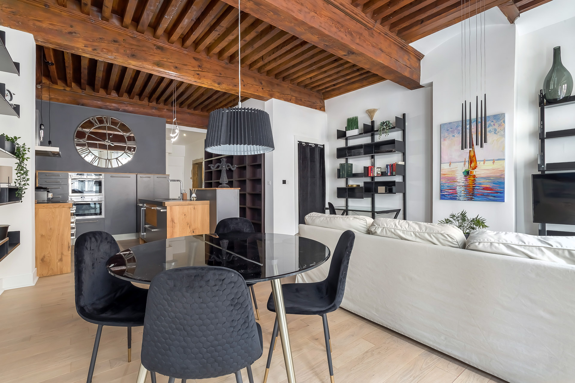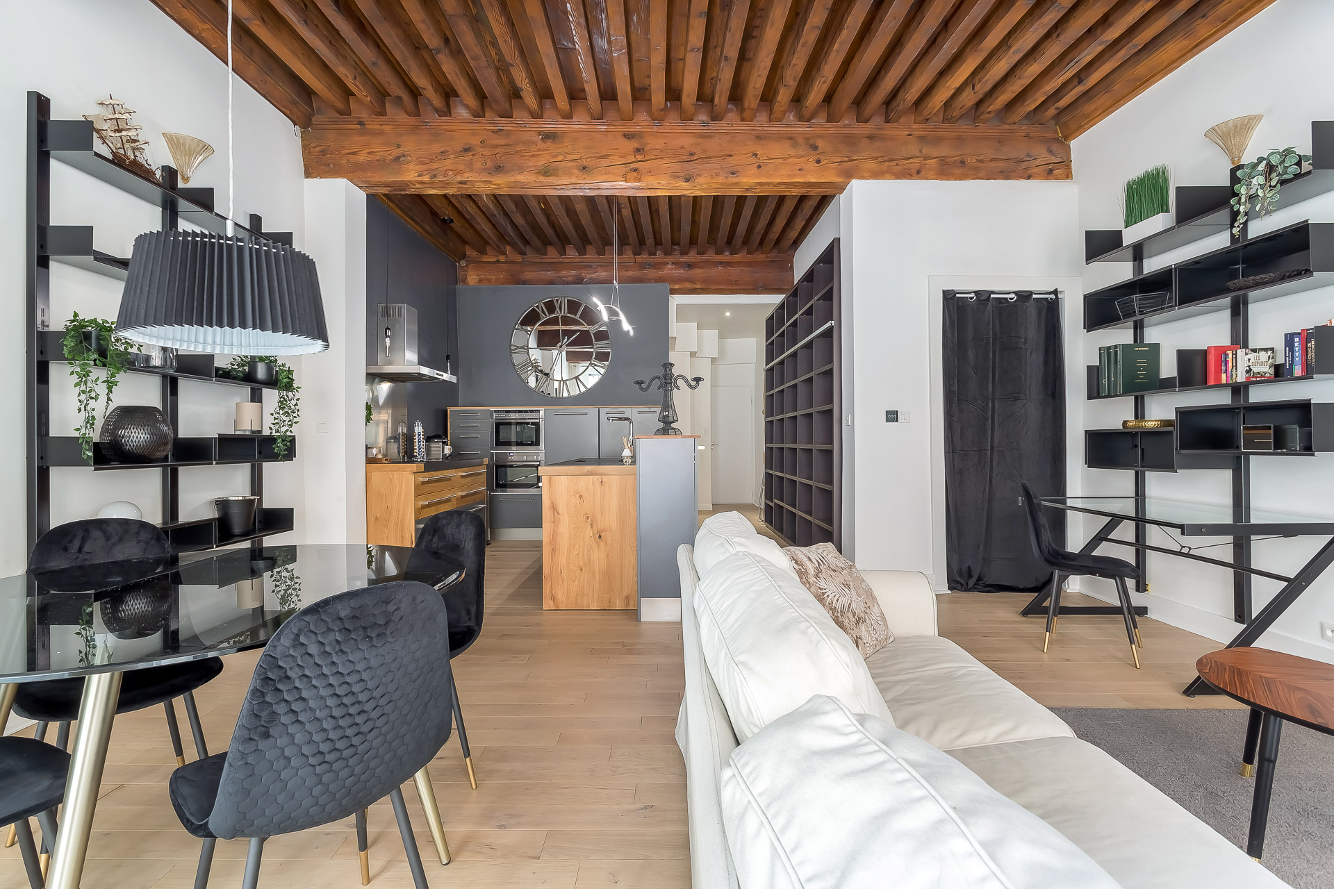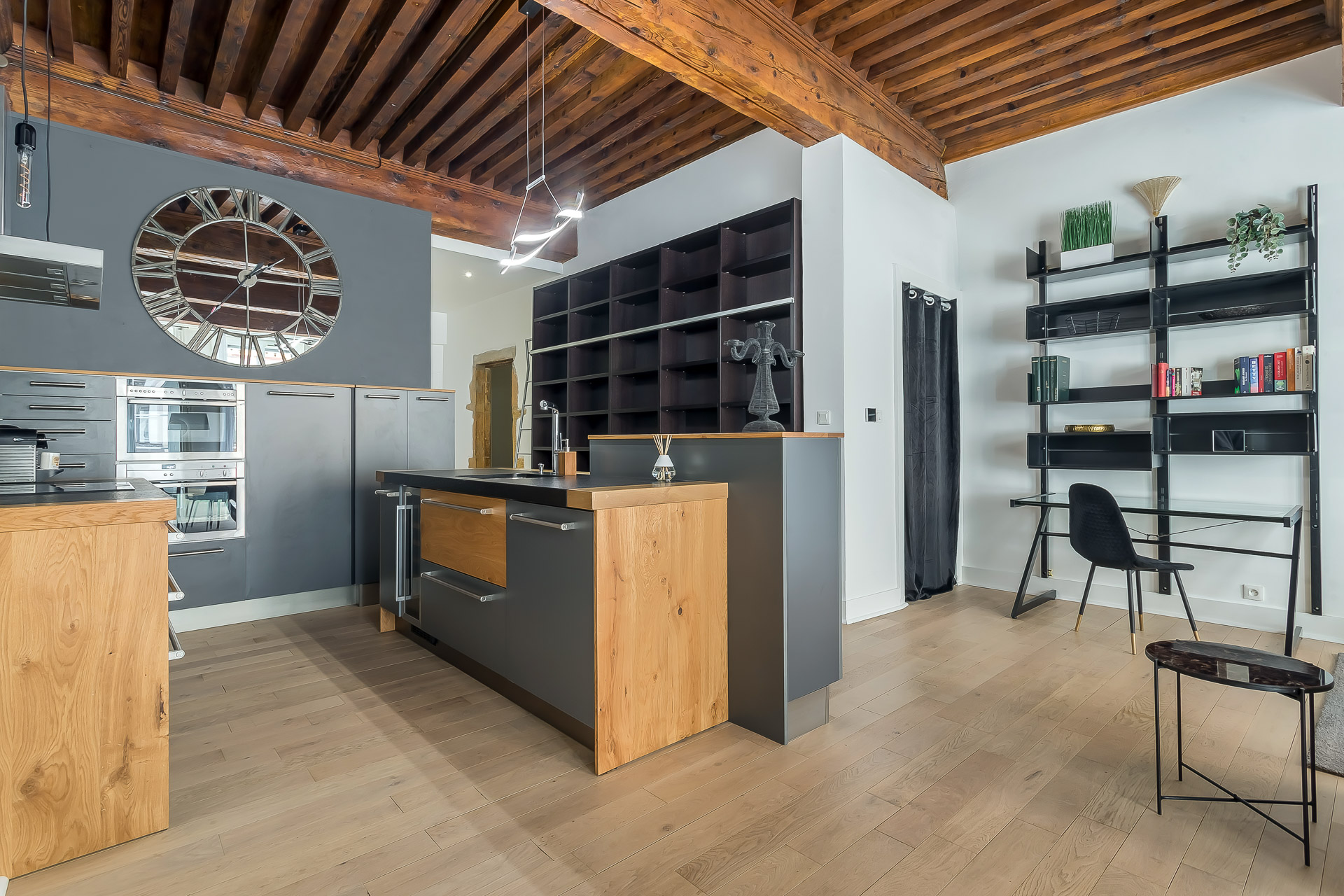 One of its standout features is the traditional French ceiling with exposed oak beams, typical of Lyon’s historic architecture. This charming architectural element adds warmth, character, and authenticity while enhancing the spaciousness of the main living area.