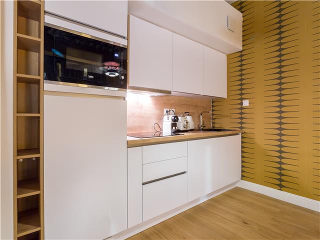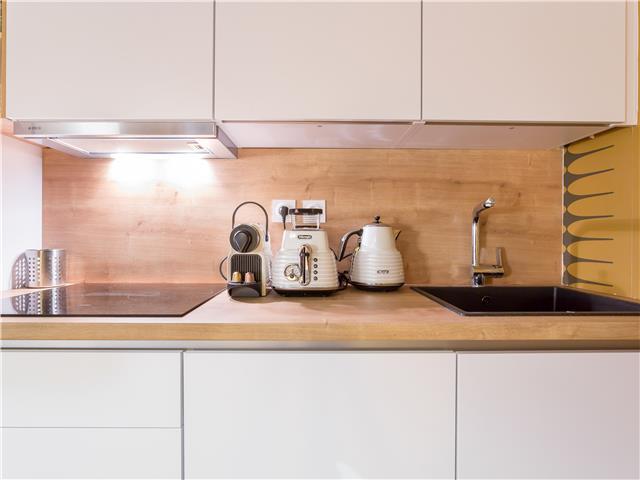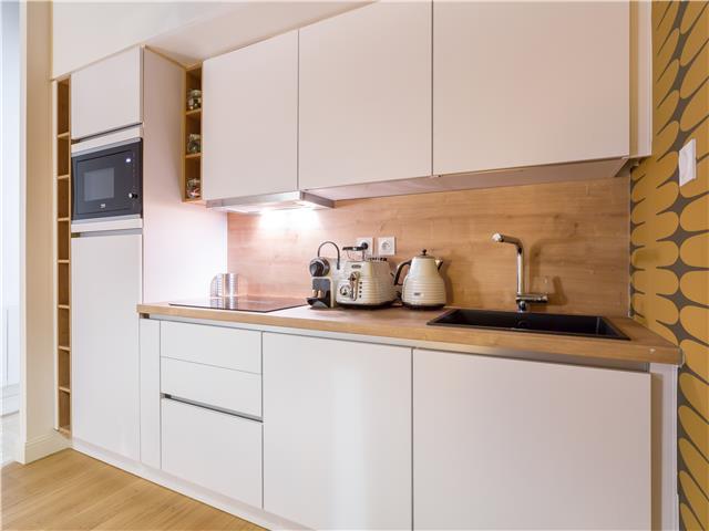 - Open-plan equipped kitchen: fridge/freezer, microwave/oven combo, dishwasher