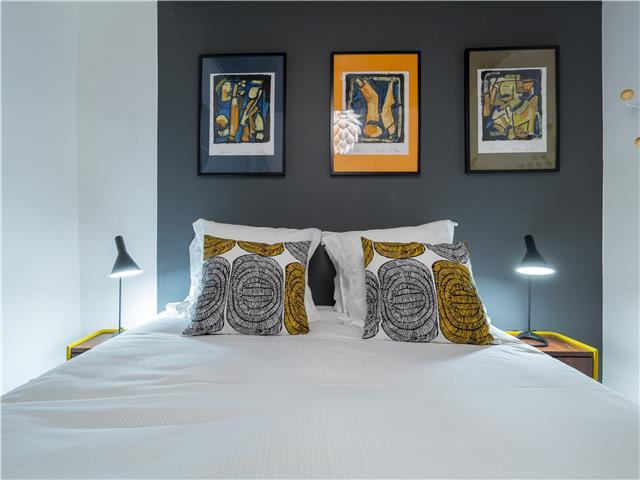 The bedroom overlooks the courtyard, ensuring a peaceful setting—perfect for a restful stay right in the heart of the Presqu’île.